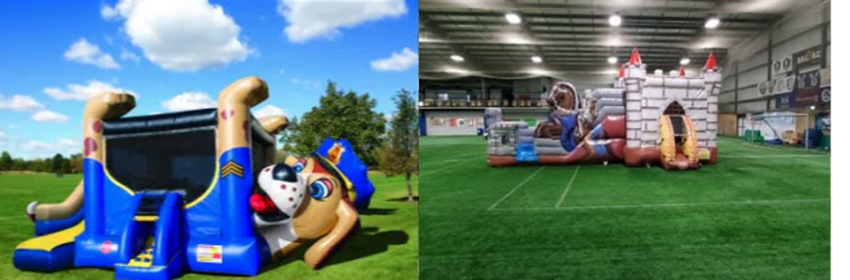 Includes "Chase-Paw Patrol" bouncy house with slide and "Knight Combo" bouncy house with 45 minutes of field time and one (1) hour in the viewing area. Extra bouncy houses available for $100 each.
